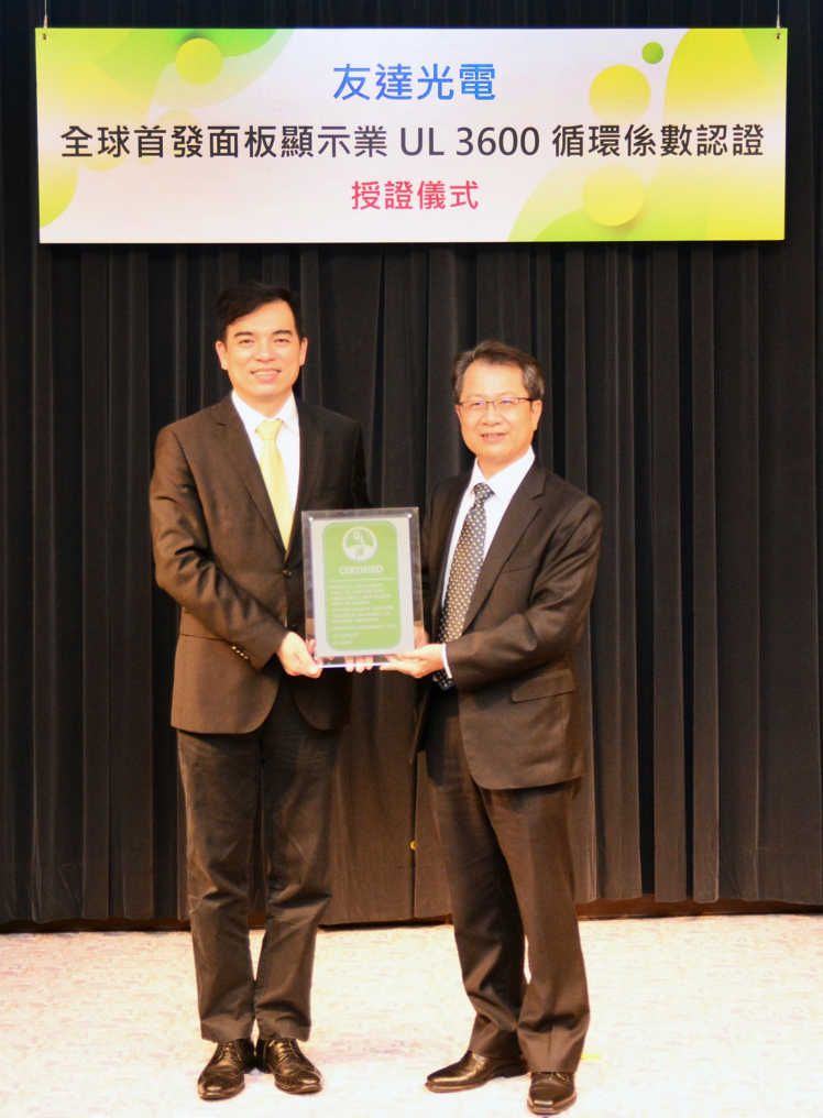 友達(dá)取得全球首張面板業(yè) UL 3600 循環(huán)係數(shù)認(rèn)證 ,由UL全球副總裁暨臺(tái)灣總經(jīng)理陳宗弘 (右) 、友達(dá)總經(jīng)理暨營(yíng)運(yùn)長(zhǎng)柯富仁 (左) 進(jìn)行授證儀式。 |