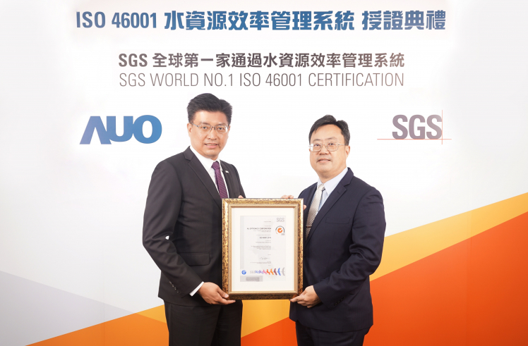 友達取得全臺第一張 ISO 46001 水資源效率管理系統(tǒng)驗證 ,透過嚴謹且精進的管理系統(tǒng) ,具體展現(xiàn)永續(xù)承諾 (左 :友達製造營運群副總經(jīng)理林挺立 ,右 :SGS 臺灣檢驗科技總裁邱志宏)